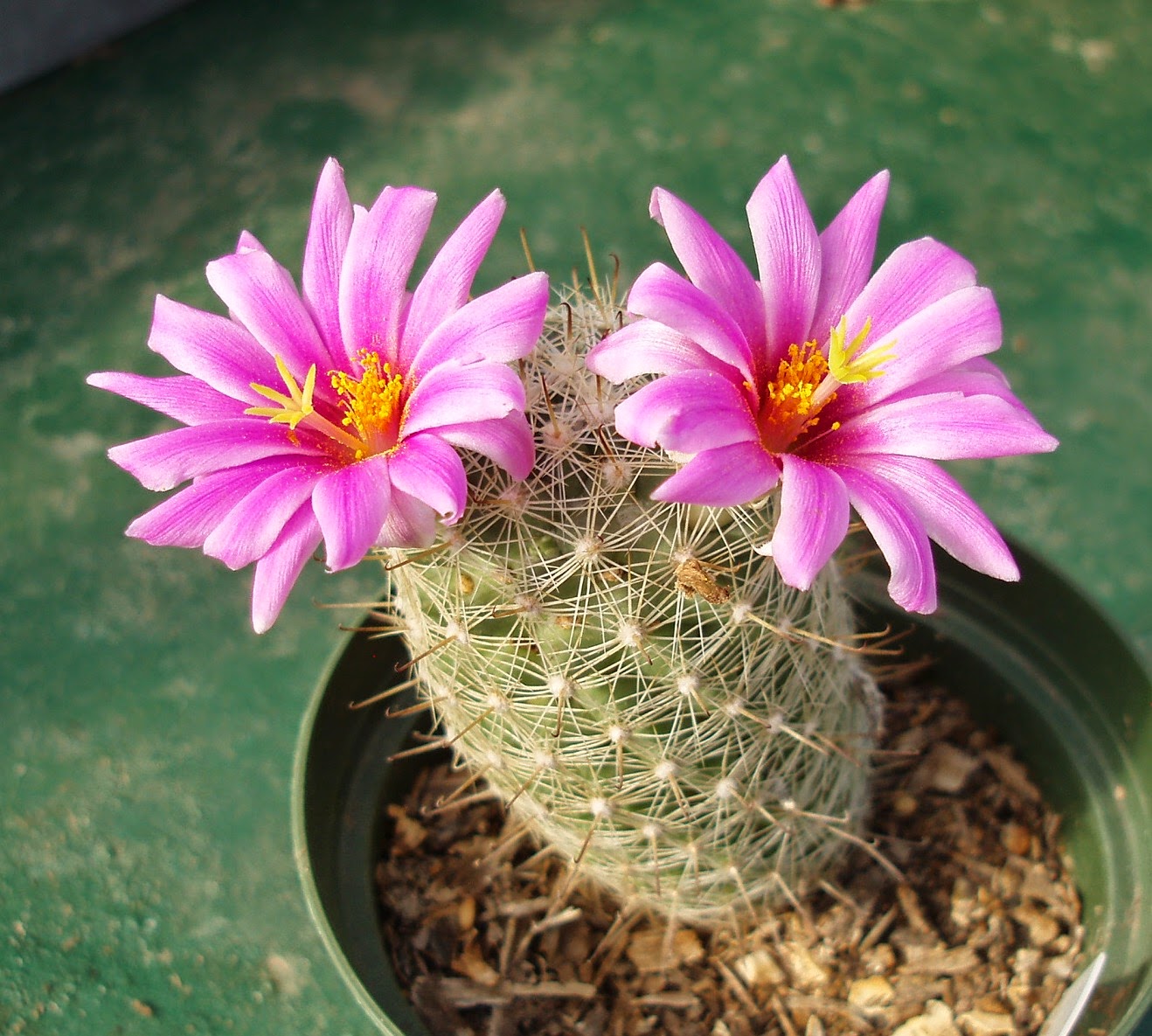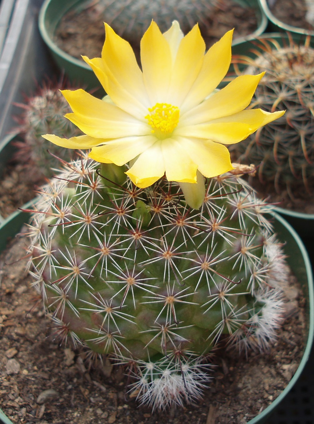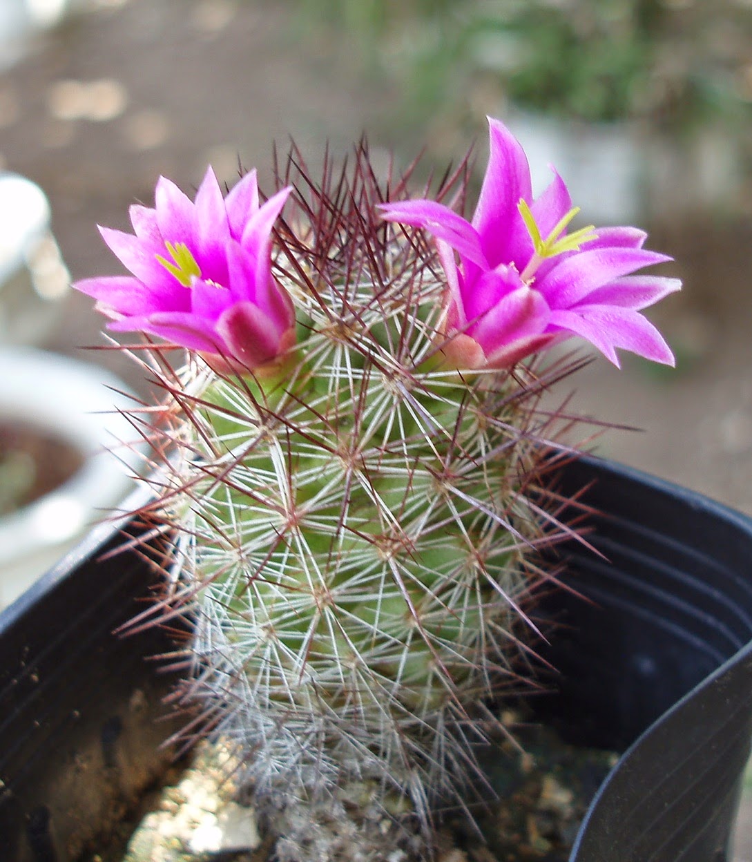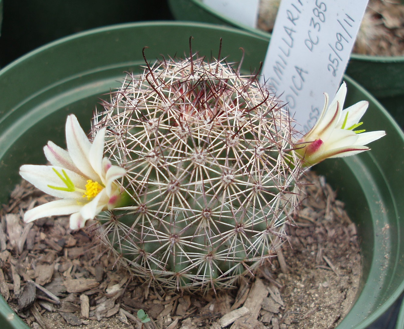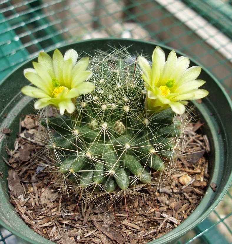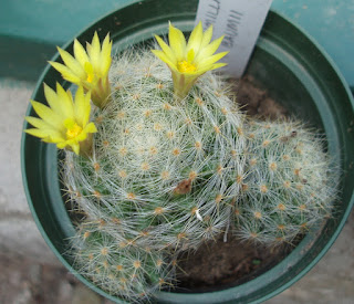 I think I have only once before ever had blooms from Mammillaria baumii, but this plant bloomed earlier this month and is flowering again now. This is one of the smallest.